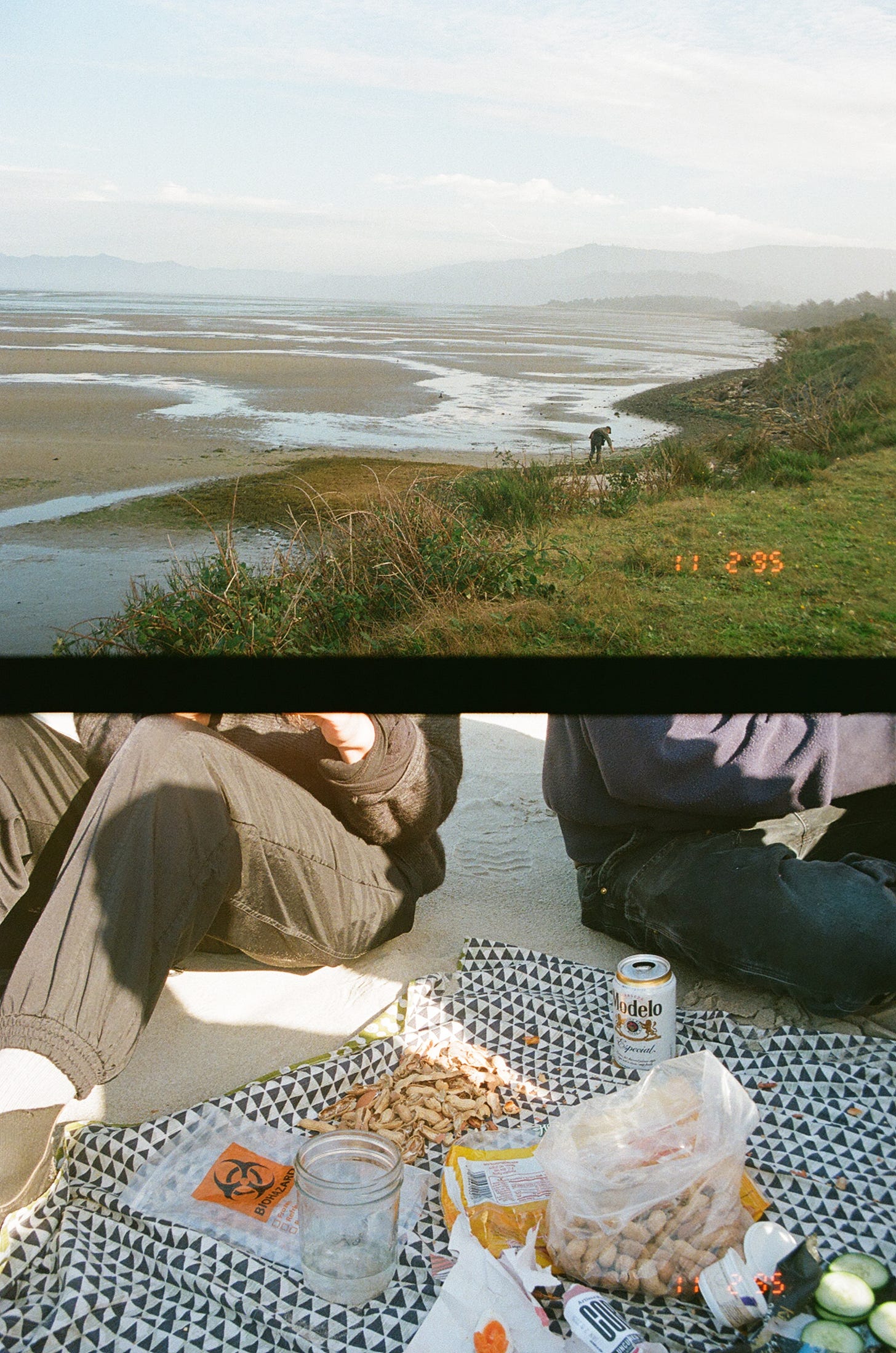 We hiked along the beach and through the pine forest anyway. Our friend Lauren brought us snacks, including unshelled peanuts in a salvaged Biohazard bag, and our friend Peter defined flotsam and jetsam, something I didn’t even realize I’d been curious about.